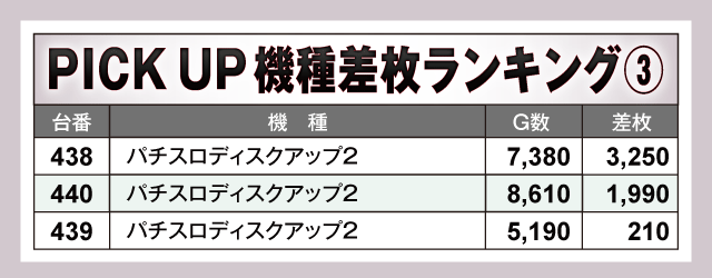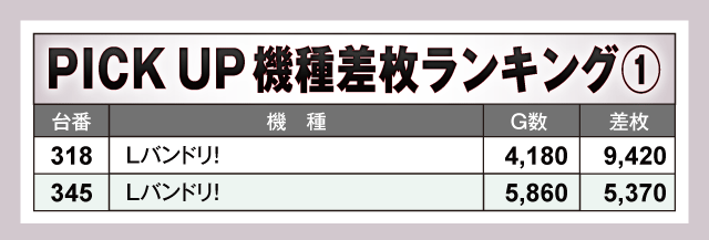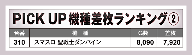 次にPICK UP機種チェックすると、ランキングトップの『Lバンドリ!』は残りの1台も+5,370枚を記録。また、『スマスロ 聖戦士ダンバイン』で+7,920枚、『パチスロディスクアップ2』で+3,250枚と軒並み好成績が連発し、今回のPICK UP機種は全ての台がプラス差枚で終了するという圧巻の結果を残している。