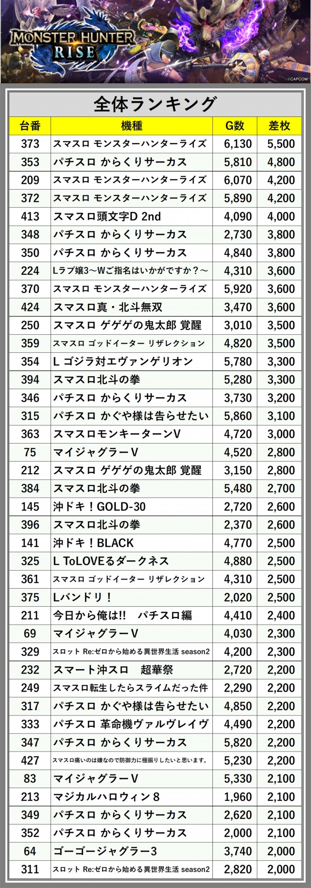 厳選された取材対象機種をはじめ、その他スロット全体から好記録が飛び出した!プレイヤーが楽しんだ1日を下記データにて振り返ってみて欲しい。