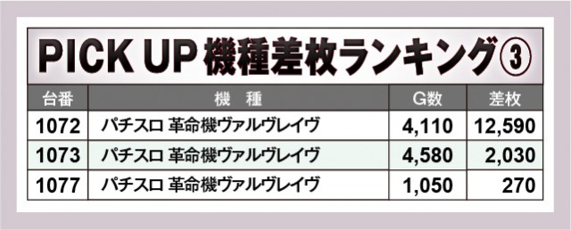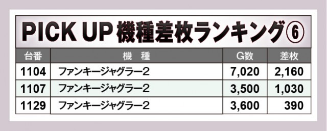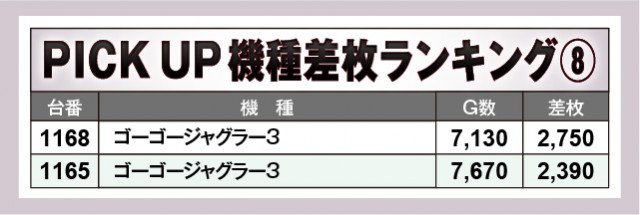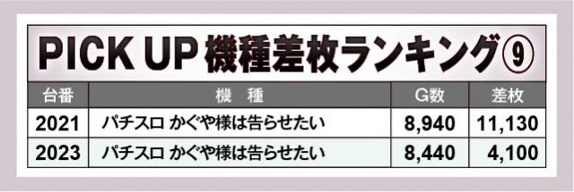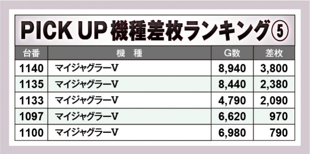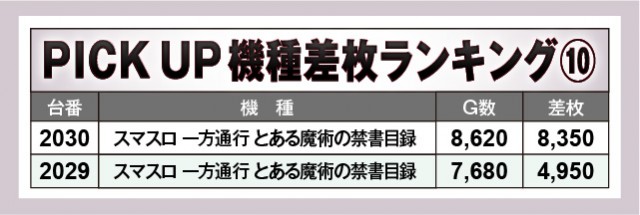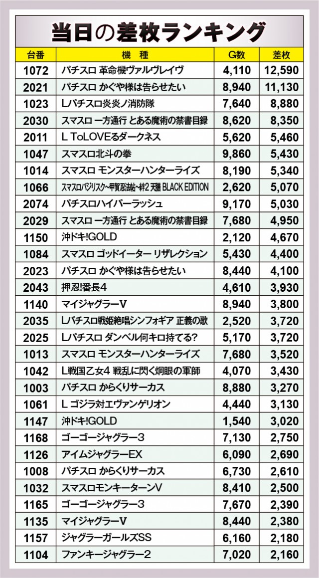『パチスロ 革命機ヴァルヴレイヴ』『パチスロ かぐや様は告らせたい』の活躍ぶりはいつまでもなく、『スマスロ モンスターハンターライズ』『スマスロ 一方通行 とある魔術の禁書目録』も同じく優秀機種として気を吐いていた。そこに『ジャグラー』シリーズも名を連ねており、コンスタントなボーナス当選はファンの口角を緩めていたに違いない。スペック問わず幅広い機種が打ち込める状況にあり、満足度の高い1日となったことだろう。