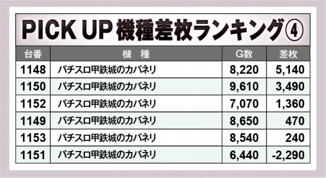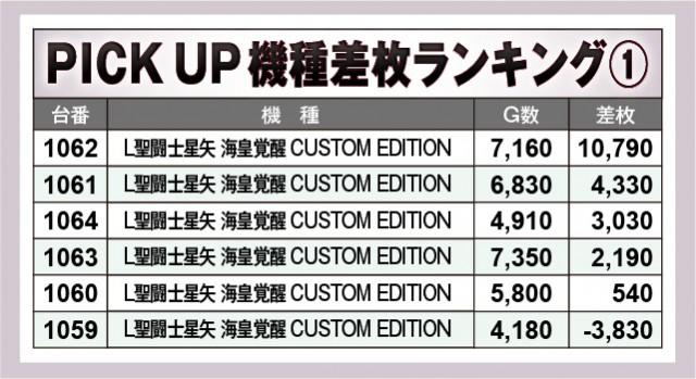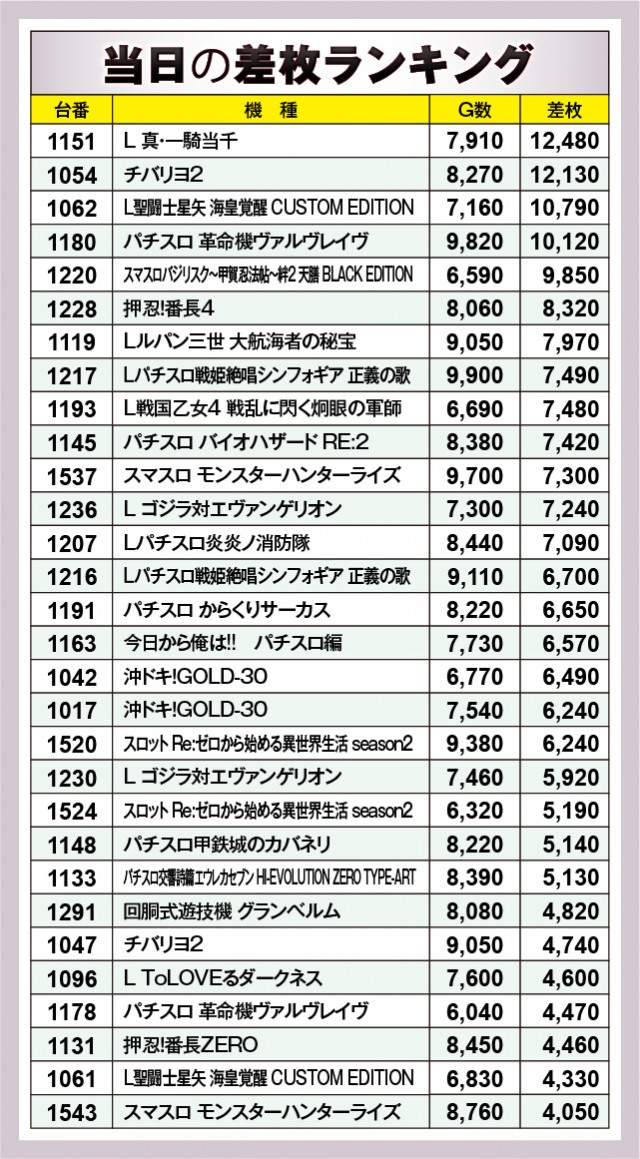 『L 真・一騎当千』『チバリヨ2』『L聖闘士星矢 海皇覚醒 CUSTOM EDITION』『パチスロ 革命機ヴァルヴレイヴ』の4台が万枚OVERを達成し、店内の盛り上がりを大きく牽引。回転数に着目すれば、ファンが相当な手応えを感じていたことが分かる内容で、ほとんどの台で8~9,000回転台をマーク。上表を一目見ても大盛況だったことが分かる内容で、遊技していたファンの満足度は高かったはずだ。