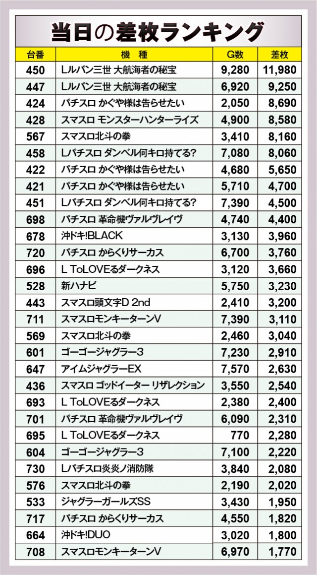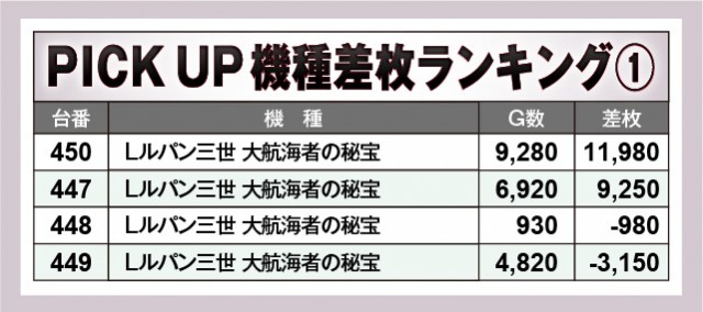 前述したように万枚OVERを達成した『Lルパン三世 大航海者の秘宝』を筆頭に、『パチスロ かぐや様は告らせたい』『スマスロ北斗の拳』など、大きな熱気を放つ台が目に焼きつく優秀機種たち。『パチスロ 革命機ヴァルヴレイヴ』『パチスロ からくりサーカス』など今なお人気を集める機種も活躍しており、これらが盛り上がりの中心になっていたと言える。その中で『ゴーゴージャグラー3』から高い活気を確認でき、回転数と差枚数が比例する展開を披露していたのも鮮烈だ。