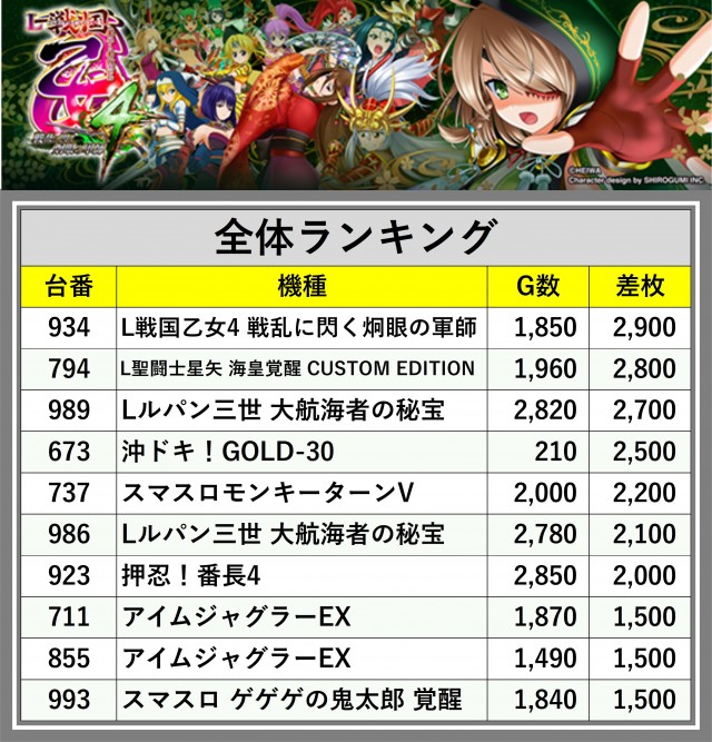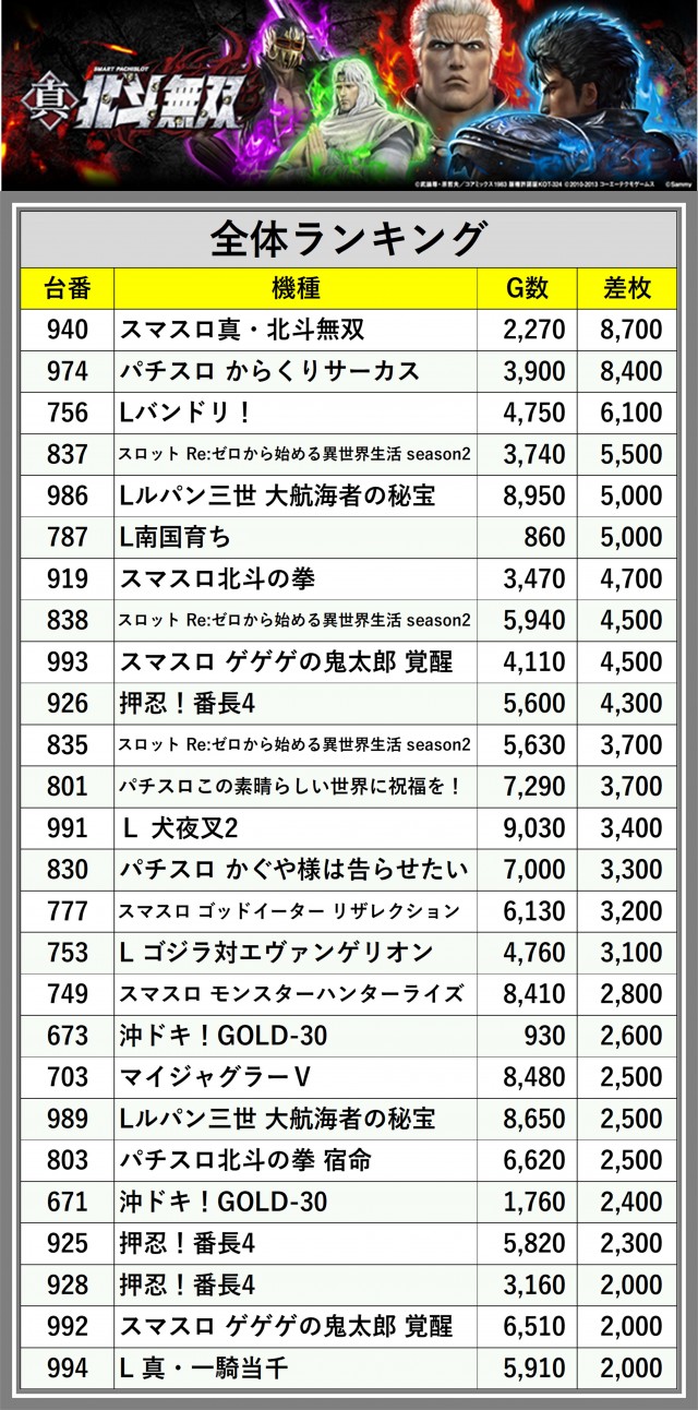 厳選された取材対象機種をはじめ、その他スロット全体から好記録が飛び出した!プレイヤーが楽しんだ1日を下記データにて振り返ってみて欲しい。
