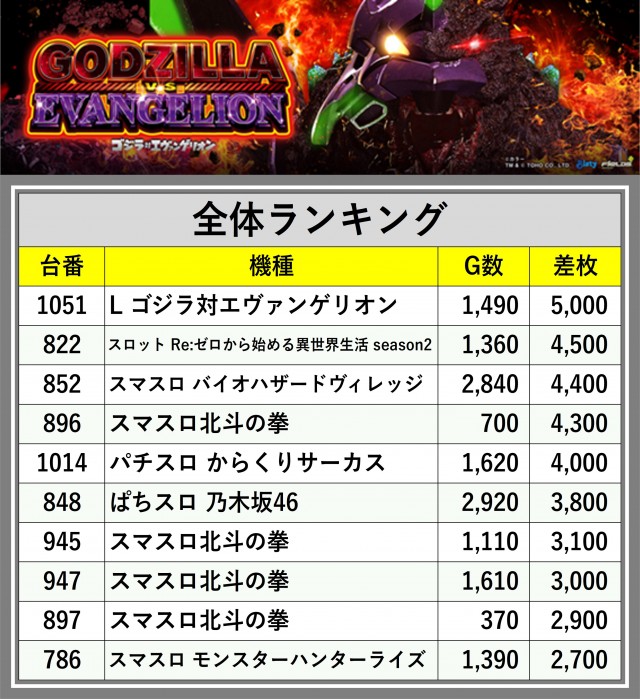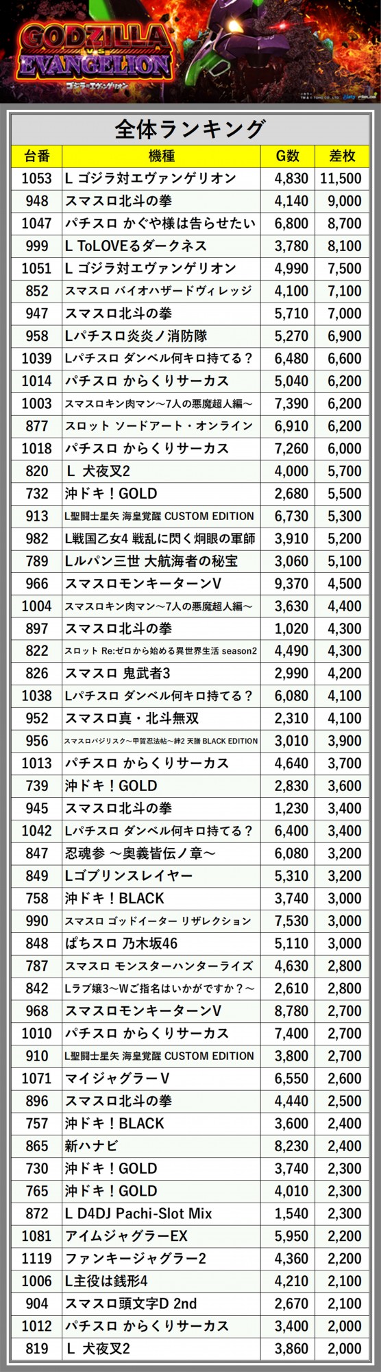 厳選された取材対象機種をはじめ、その他スロット全体から好記録が飛び出した!プレイヤーが楽しんだ1日を下記データにて振り返ってみて欲しい。
