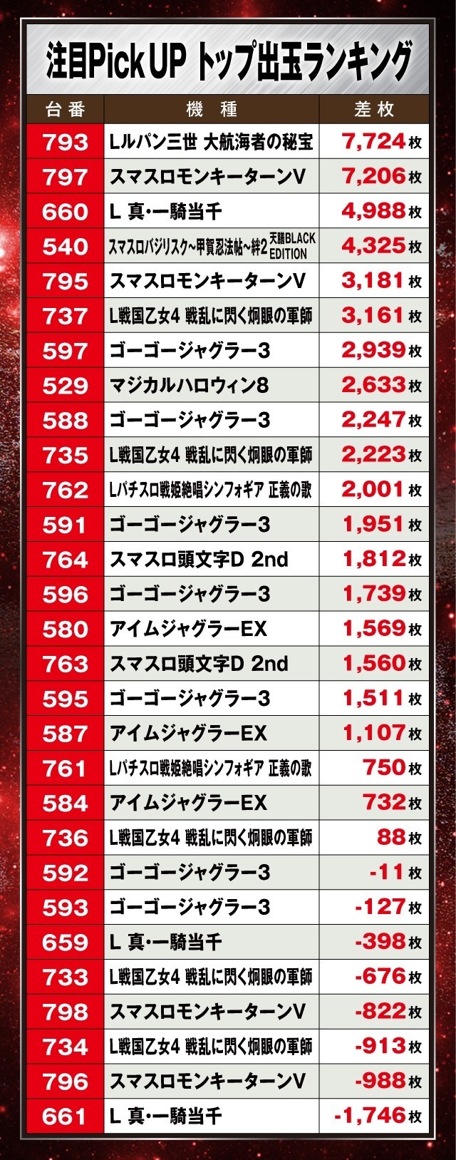 また、その他の機種で目立っていたのが『ゴーゴージャグラー3』で、597番台の+2,939枚を皮切りに+1,000枚超の台が大量発生!! スマスロに負けない勢いを見せファンを喜ばせていた。