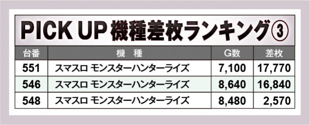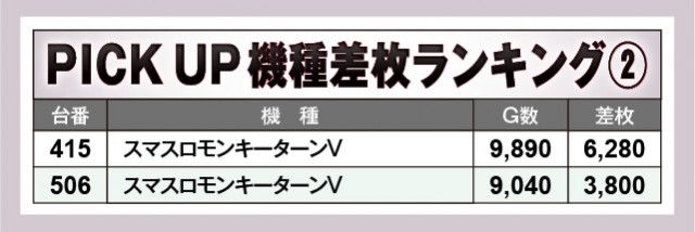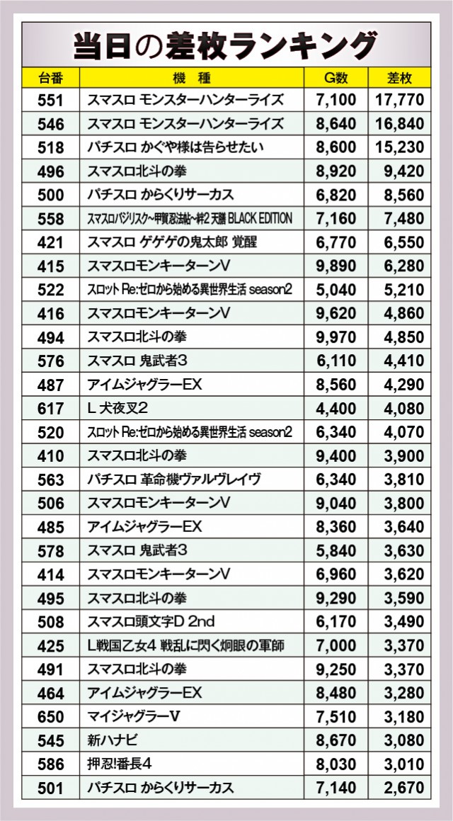 『スマスロ モンスターハンターライズ』にて2台の万枚OVERが生まれ、凄まじい熱気で店内を盛り上げてくれた。それは『スマスロ北斗の拳』も同様で、『スマスロモンキーターンV』も含め、好感触から終日を通して打ち込まれていたのが鮮烈だ。また『マイジャグラーⅤ』も回転数と差枚数が比例する展開を披露しており、優秀機種のポテンシャルを引き出してくれたファン諸氏には脱帽せざるを得ない。