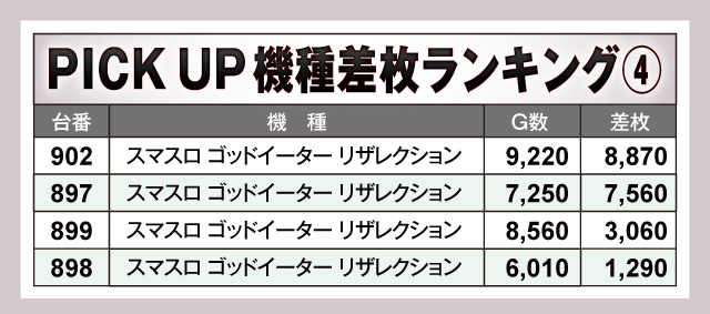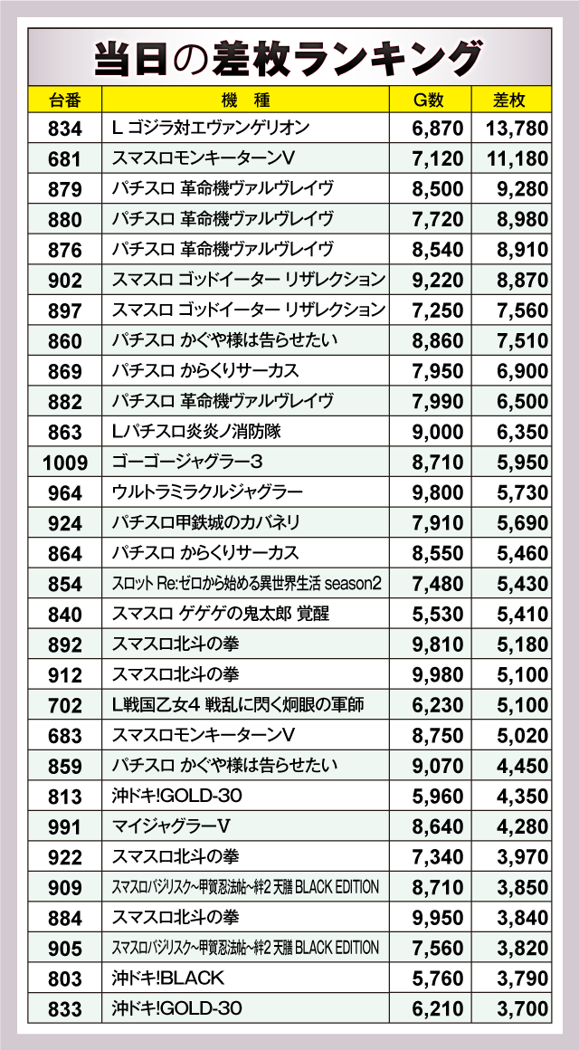 この日は、人気のスマスロを中心に+5,000枚超の台が大量発生!! そんな中、ランキングトップに輝いたのは+13,780枚を叩き出した『L ゴジラ対エヴァンゲリオン』であった。次いで2位には『スマスロモンキーターンV』がランクイン、こちらも万枚超+11,180枚を記録している。