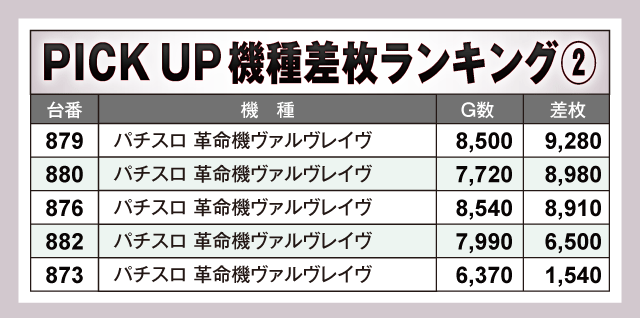 次にPICK UP機種をチェックしてみよう。特に注目すべきが『パチスロ 革命機ヴァルヴレイヴ』で、万枚超こそなかったものの879番台の+9,280枚をはじめ+8,000枚超が2台も発生する盛況ぶりを見せた。また、『スマスロ北斗の拳』は全26台中20台がプラス差枚で終了しているだけに、ファンにとっては充実の一日となったはずだ。