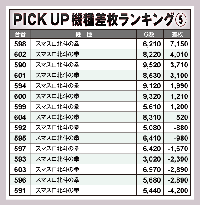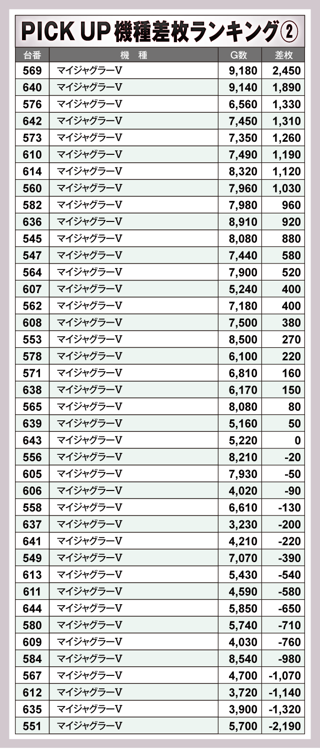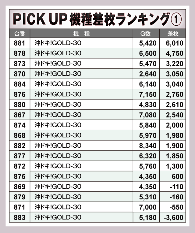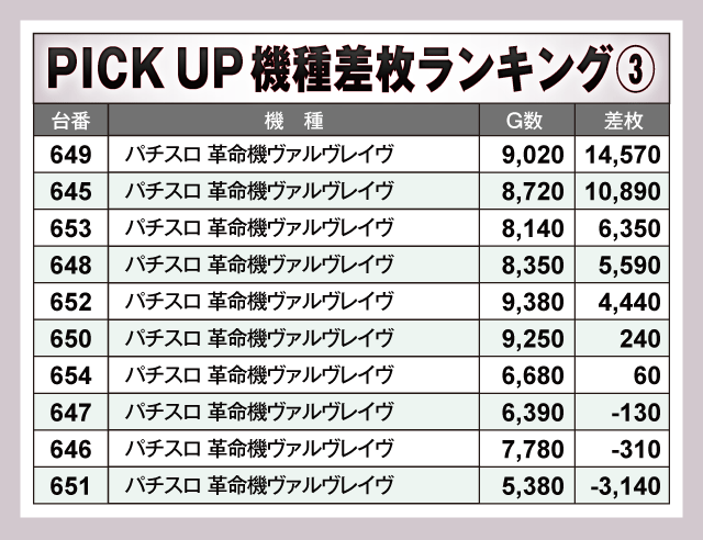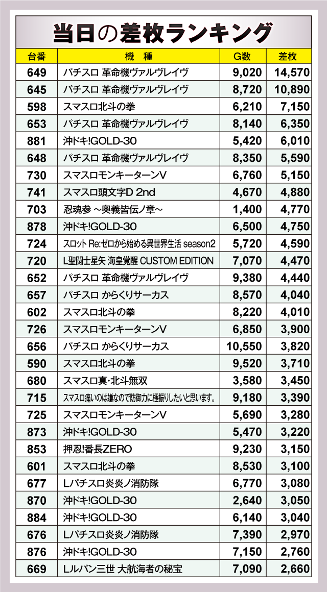 この日はなんといっても『パチスロ 革命機ヴァルヴレイヴ』がアツかった!! 649番台が+14,570枚、645番台が+10,890枚と、万枚超が2台も発生する圧倒的パフォーマンスを披露していた。また、その他の機種も負けてはおらず『スマスロ北斗の拳』で+7,000枚超、『沖ドキ!GOLD-30』で+6,000枚超が飛び出している。