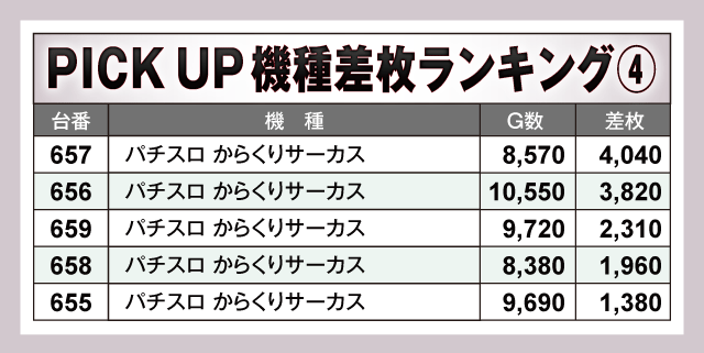 次にPICK UP機種チェックすると、それぞれの機種から好成績が多数確認できた。そんな中、特に目立っていたのが『パチスロ からくりサーカス』で、657番台の+4,040枚を筆頭に5台全てがプラス差枚で終了するという見事な結果を残しているだけに、シマ内は常にファンの笑顔と熱気に満ち溢れていた。