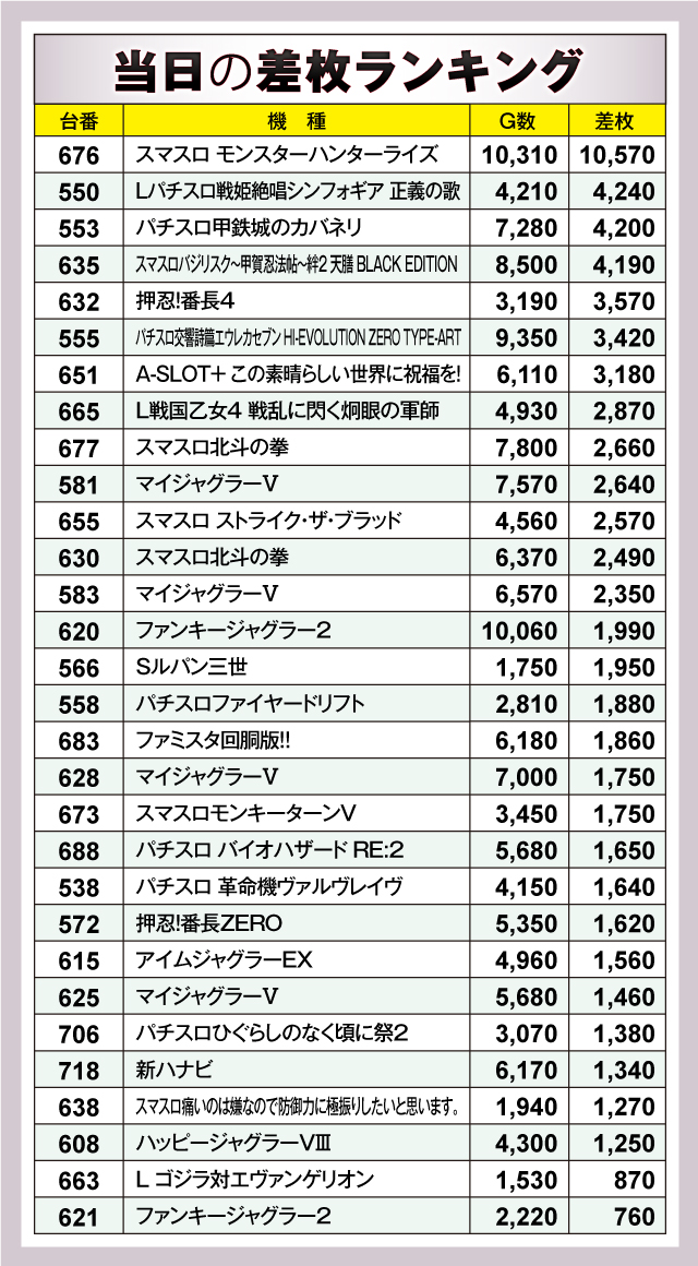 首位の座に輝いたのは『スマスロ モンスターハンターライズ』。676番台が+10,570枚と唯一の万枚突破を果たしている。つづいて『Lパチスロ戦姫絶唱シンフォギア 正義の歌』550番台が+4,240枚、『パチスロ甲鉄城のカバネリ』553番台が+4,200枚、『スマスロバジリスク~甲賀忍法帖~絆2 天膳 BLACK EDITION』635番台が+4,190枚と好結果を残した。