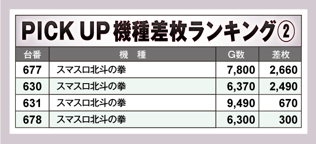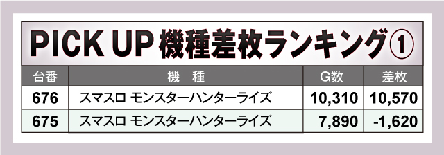 ここでは注目マシン4機種を個別でチェックしていこう。2台ある『スマスロ モンスターハンターライズ』は、676番台がトップ差枚だったかわりに675番台がマイナス差枚と大きな開きができてしまった。『スマスロ北斗の拳』は全台がプラス差枚で、上々の結果といえるだろう。