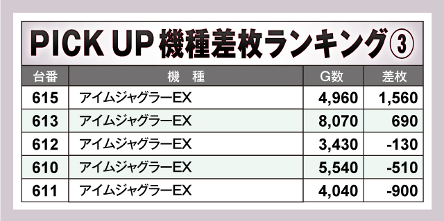 『アイムジャグラーEX』は8,000G以上まわした613番台がプラス差枚を記録。また、8台ある『マイジャグラーⅤ』も全体でプラス差枚を記録し、9,000G以上まわされた台もあるなど、可能性を秘めていたことが感じられた。
