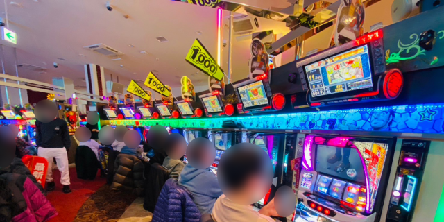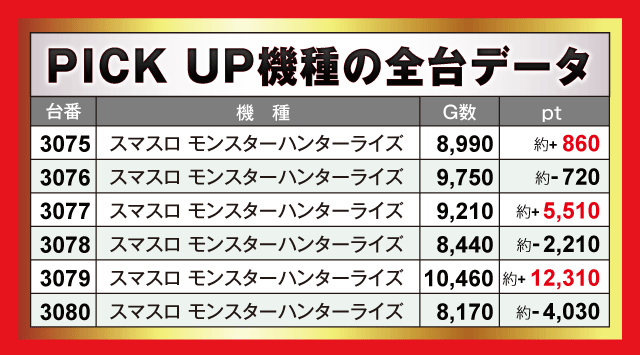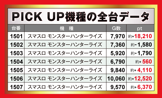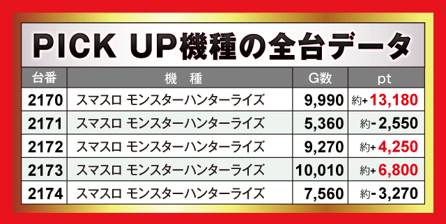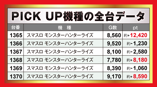 今回の全店共通PICK UP機種は『スマスロ モンスターハンターライズ』。全店舗の総台数は24台で、平均差枚は3,800pt超という見事な結果を残してるだけに、各店舗のシマは常に活気に包まれる一日となった。