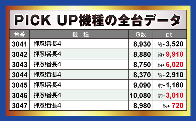 楽園上新屋店は『押忍!番長4』をPICK UP。3042番台が+9,000pt超、3043番台が6,000pt超と2台並びで好成績が飛び出しているだけでなく半数以上の台がプラス差枚で実戦を終えている。