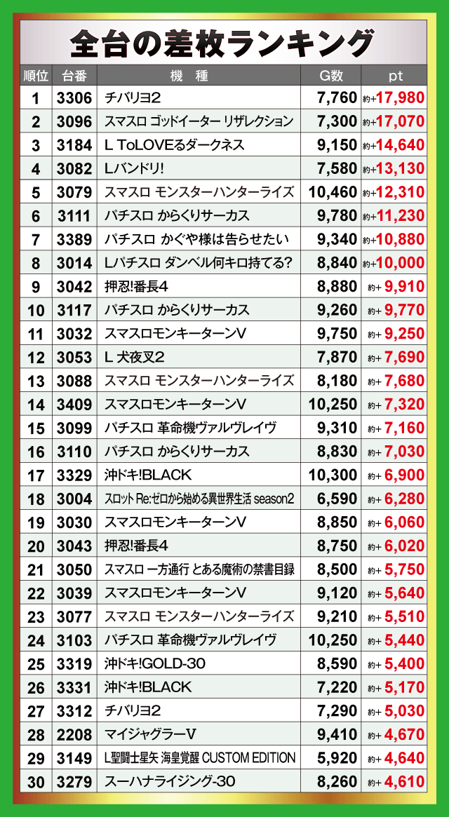 楽園浜松ザザシティ店は12,000pt超以外に8,000pt超が2台も発生しており、半数の台がハイレベルな出玉を叩き出していた。