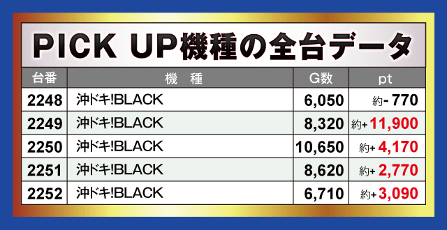 楽園沼津店は2170番台の13,000pt超を筆頭に6,000pt超と4,000pt超が出現しており全5台中3台がプラス差枚で終了している。