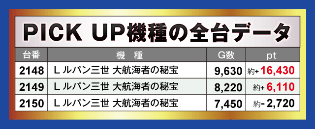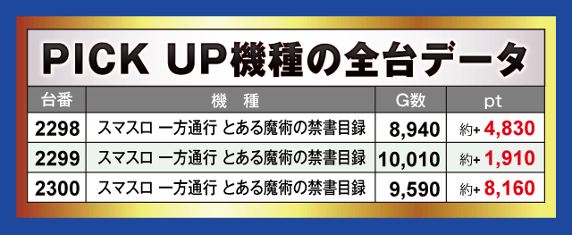 楽園沼津店がPICK UPしたのは3機種。新台の『スマスロ 一方通行 とある魔術の禁書目録』は+8,000pt超をはじめ3台全てがプラスに。『沖ドキ!BLACK』と『Lルパン三世 大航海者の秘宝』はそれぞれが万枚超を達成した。