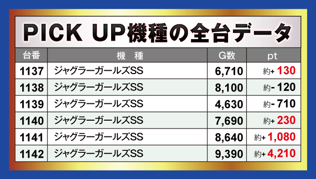 楽園浜松ザザシティ店は『A-SLOT+ この素晴らしい世界に祝福を!』が全台プラス。さらに『ジャグラーガールズSS』では1142番台が4,000pt超という見事な結果を残し注目を集めていた。