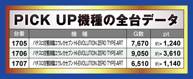 楽園袋井店のPICK UP機種は全台がプラスで終了。しかも、『新ハナビ』は4台中3台が4,000pt超、『パチスロ交響詩篇エウレカセブン HI-EVOLUTION ZERO TYPE-ART』からも3,000pt超が発生している。