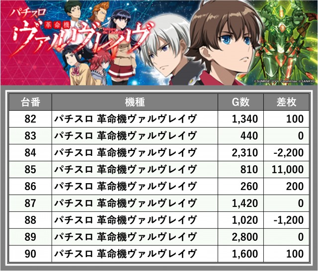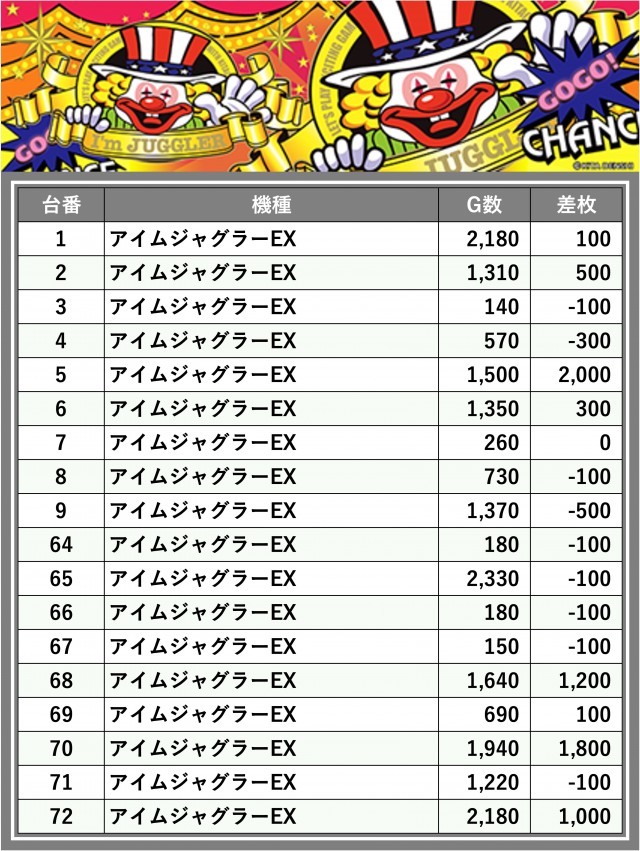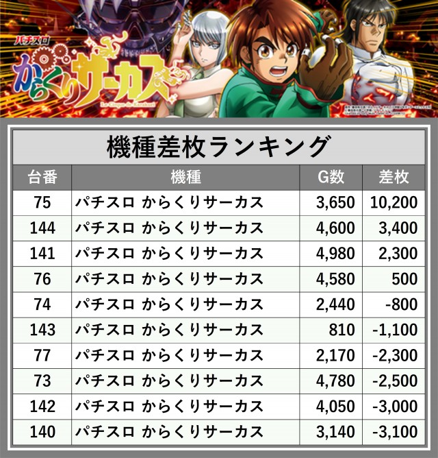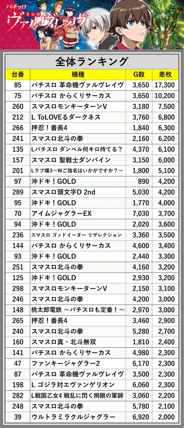※差枚数順に掲載しています