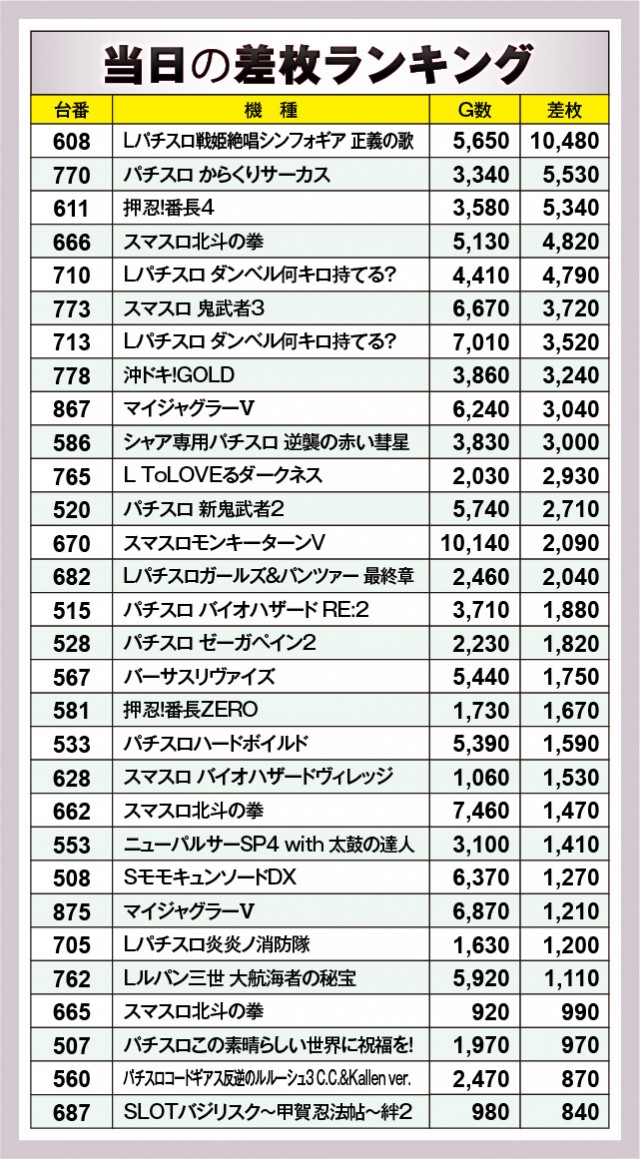 『Lパチスロ戦姫絶唱シンフォギア 正義の歌』から万枚OVERという大きな熱量が確認でき、当日の店内の盛り上げ役として奮起していた。後続は『パチスロ からくりサーカス』『押忍!番長4』が5,000枚OVERとなっており、各所で大きな熱気が放たれていたのが分かる。また『スマスロモンキーターンV』にで万回転OVERが確認でき、打ちごたえのある状況だったのは間違いないだろう。