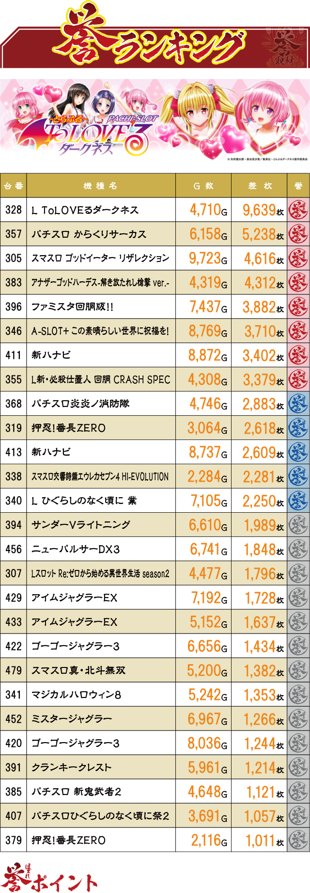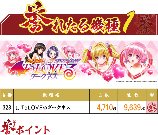 前回12月30日から約1ヶ月、今回の誉ランキングで1位記録を奪取したのは『L ToLOVEるダークネス』だった。惜しくも10,000枚を突破することは叶わなかったが、優秀台を確信するに十分な挙動だった様子。また今回は1台機種・2台機種の活躍がいつも以上に目立っていた!