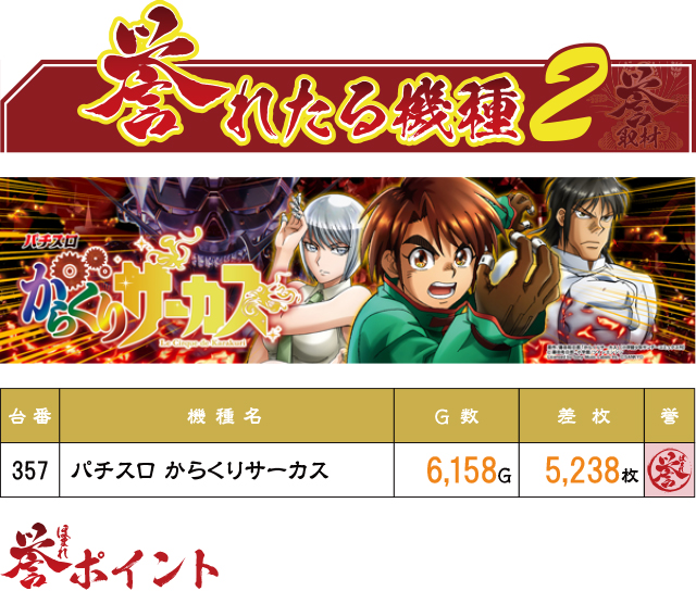 同じく1台設置の『パチスロ からくりサーカス』からも好記録が出現!良好な挙動を見せていたこの台、最終的には危なげなく5,000枚オーバーを達成してくれた。