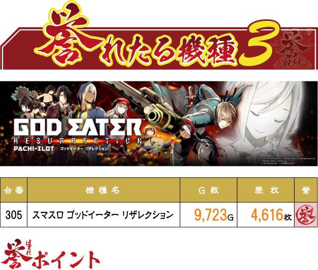 『スマスロ ゴッドイーター リザレクション』は2台設置。そのうちの1台である305番台が優秀台ムーブを見せ、4,500枚超えを実現した。良好すぎるその挙動に、打っていた方は早い段階でその正体に気づいていたのではないだろうか。