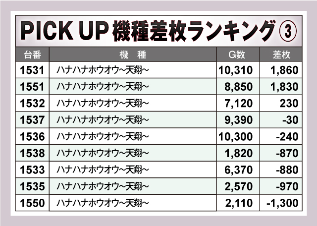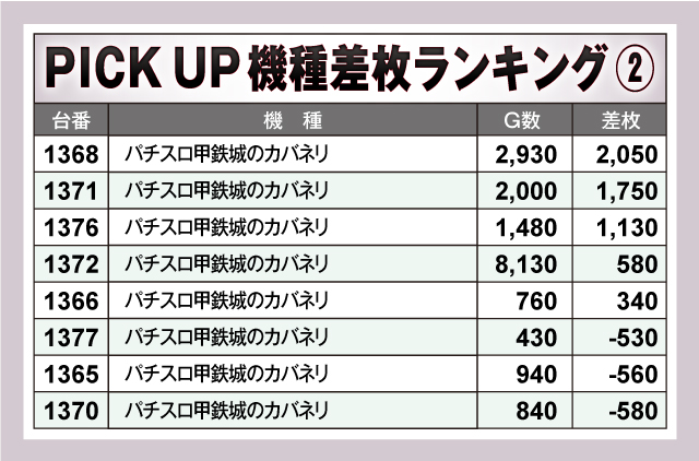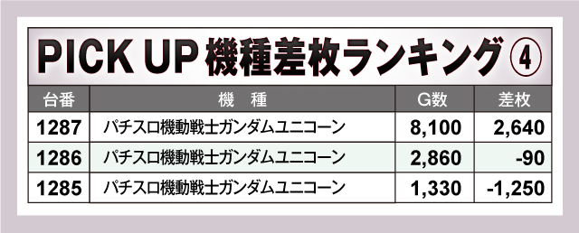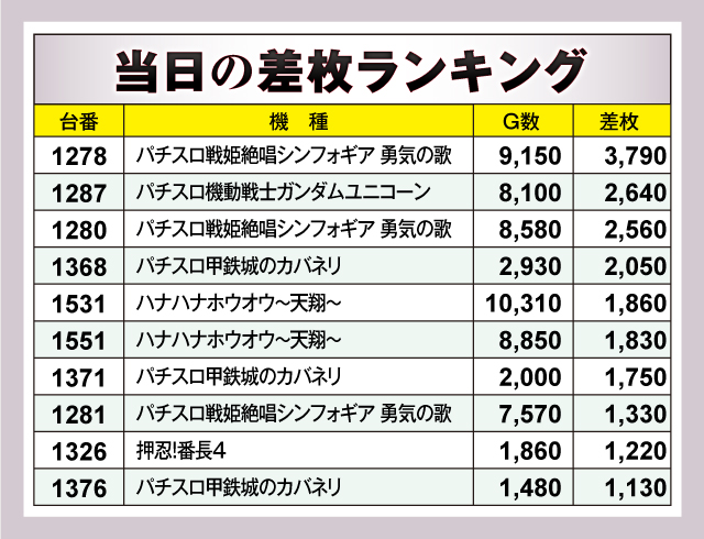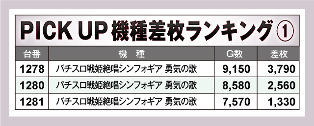 まずは差枚ランキングのチェックから。全10台すべてが差枚+1,000枚オーバーで、+2,000枚オーバーは4台出現。それらのなかでもっとも優秀だった台は、1278番台の「パチスロ戦姫絶唱シンフォギア 勇気の歌」で、差枚は+3,790枚を獲得! またランクイン機種を見渡すと、流行りのスマスロではなく、6.5号機の活躍が目立ち、最優秀台を獲得した「パチスロ戦姫絶唱シンフォギア 勇気の歌」のほかにも「パチスロ甲鉄城のカバネリ」「パチスロ機動戦士ガンダムユニコーン」などの機種の活躍が見てとれた。