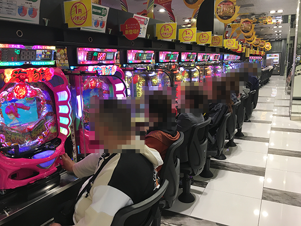 1円パチンコの稼働率も高く、海物語シリーズを筆頭ににぎやかな状況。