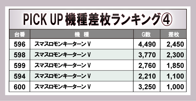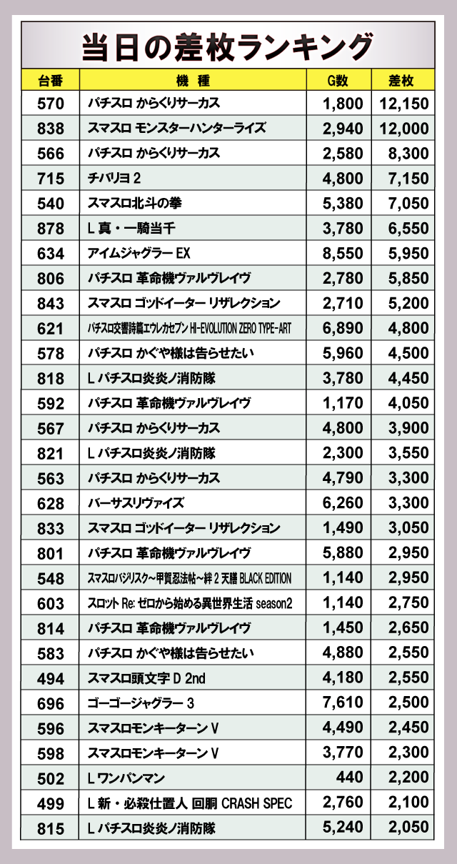 上表に注目してみると、『パチスロ からくりサーカス』『パチスロ 革命機ヴァルヴレイヴ』『スマスロ北斗の拳』『スマスロモンキーターンV』といった人気機種から優秀台が存在し、ホール中で大いに盛り上がりを見せていた。