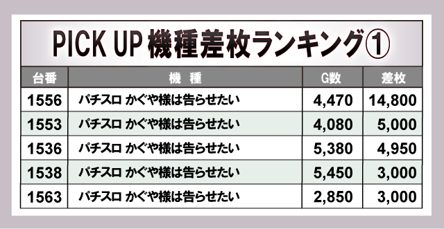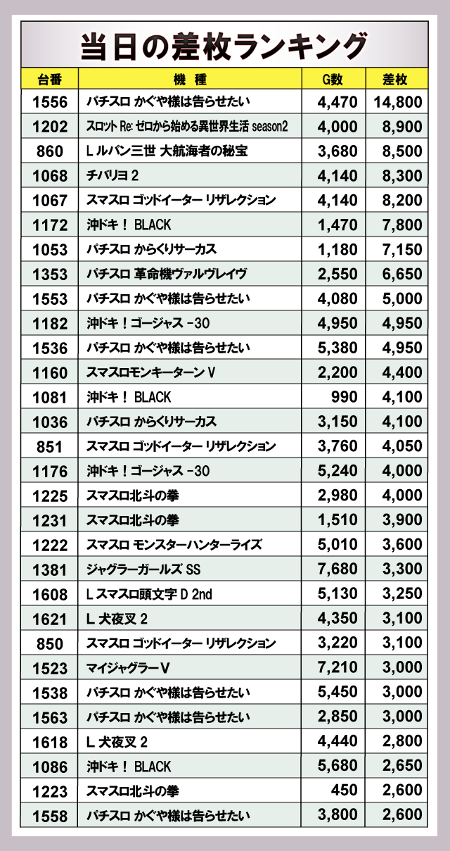 『パチスロ かぐや様は告らせたい』から万枚OVERが発生。その他にも、『スロット Re:ゼロから始める異世界生活 season2』『Lルパン三世 大航海者の秘宝』『チバリヨ2』『スマスロ ゴッドイーター リザレクション』から+8,000枚OVERをマークするなど、スマスロを筆頭に盛り上がりを形成しており、各所でファンが笑顔を浮かべる光景が広がっていた。