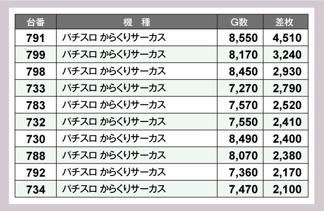 この日はパチスロ・パチンコ共に様々な機種で好調台を確認。パチスロで最も盛り上がりを見せていたのが『パチスロ からくりサーカス』で、791番台の+4,510枚を筆頭に+2,000枚超が9台も発生する好成績を残している。
