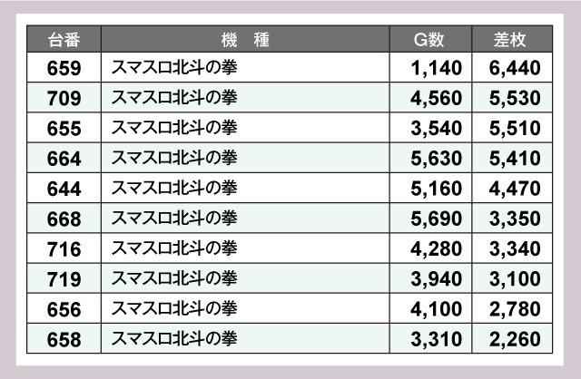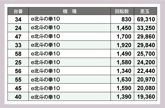次に、パチンコの方をチェックしてみると『e北斗の拳10』から+20,000発超が大量発生!! なかでも34番台が驚異の+69,310発を叩き出しプレイヤーの注目を集めていた。