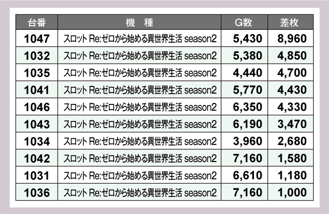 この日のメインはパチスロとなっており、最も盛り上がりを見せていたのが『スロット Re:ゼロから始める異世界生活 season2』で、1047番台の+8,960枚を筆頭に4,000枚超が4台も発生する盛況ぶりであった。