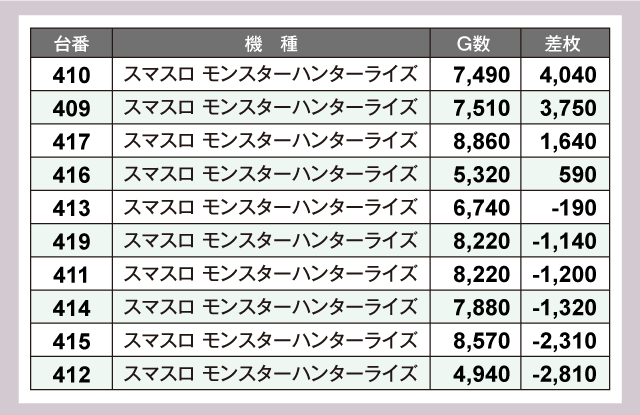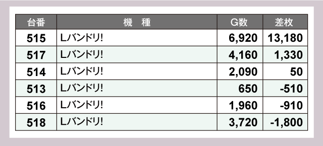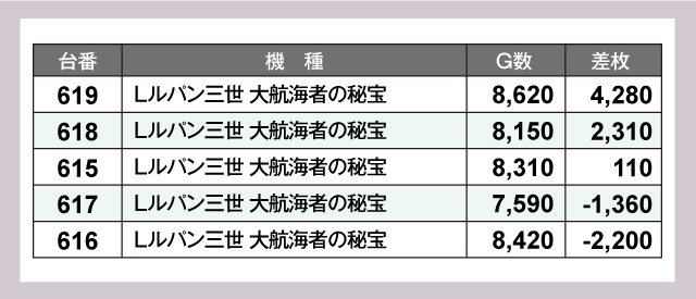 また、その他の機種では『Lバンドリ!』で万枚超の+13,180枚が発生、さらに、この日に導入された最新台『Lルパン三世 大航海者の秘宝』も奮闘しており、619番台が+4,000枚超を記録している。