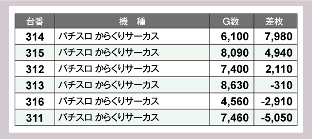 まず、パチスロをチェックすると『パチスロ からくりサーカス』が盛り上がりを見せており、314番台が+7,980枚を記録。しかも、全6台中3台がプラス差枚で終了しているだけに、ファンとっては充実した一日になったといえるだろう。