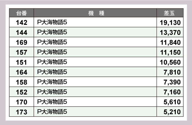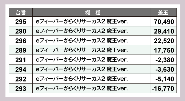 一方、パチンコで目立っていたのも『eフィーバーからくりサーカス2 魔王ver.』で、怒涛の+70,490発を筆頭に+20,000発超が2台も発生する驚異的な結果を残している。また、『P大海物語5』からも万発超が5台と、定番の人気機種もしっかりと奮闘していた。