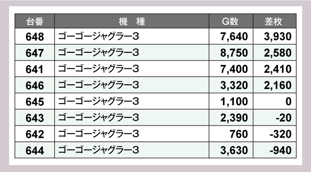 特に目立っていたのが『ゴーゴージャグラー3』で、全8台中4台がプラス差枚で終了しており、それらが全て+2,000枚超を記録。この安定感はジャグラーシリーズならではの魅力と言えるだろう。