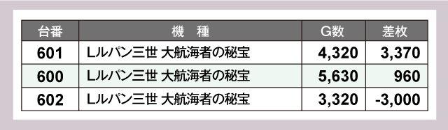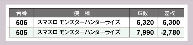 また、『スマスロ モンスターハンターライズ』から+5,000枚超、『Lルパン三世 大航海者の秘宝』から+3,000枚超と、比較的新しめの機種も奮闘し店内を盛り上げていたのが印象的であった。