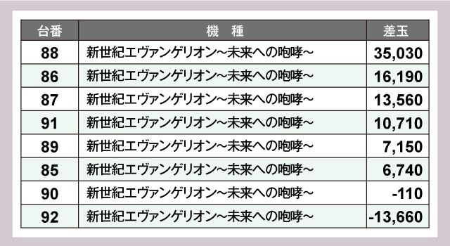 パチンコでは『新世紀エヴァンゲリオン〜未来への咆哮〜』が+30,000発オーバーなど、圧巻のパフォーマンスを披露していた。