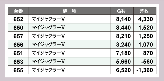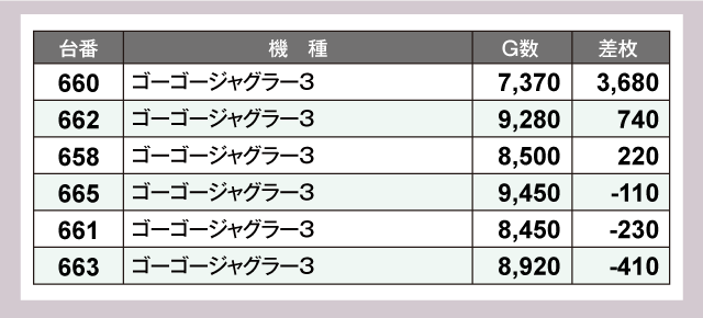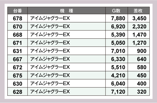 特にお店の看板機種ともいえる『アイムジャグラーEX』で好調台を多数確認。678番台の+3,000枚超を筆頭に半数の台がプラス差枚で実戦を終了する見事な結果を残している。