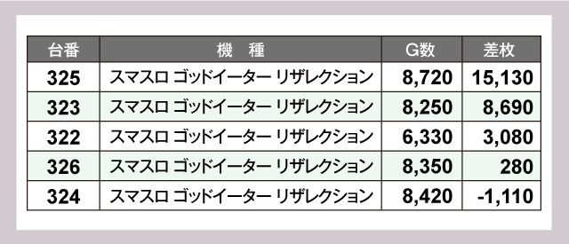 まずは、パチスロコーナーをチェックしてみると、特に目立っていたのが『スマスロ ゴッドイーター リザレクション』で、怒涛の+15,130枚が発生!! しかも、全5台中4台がプラス差枚で終了する盛況ぶりであった。