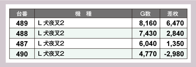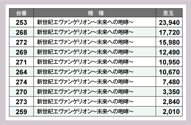 一方のパチンコは『新世紀エヴァンゲリオン〜未来への咆哮〜』で万発超が多数出現。しかも、253番台の+23,940発、268番台の+17,720発といったハイレベルな成績が連発しているだけにシマ内は常に活気に溢れていた。