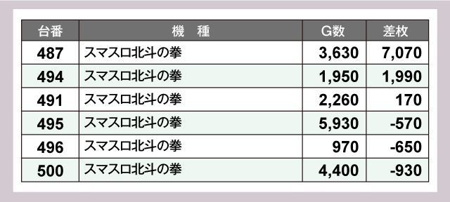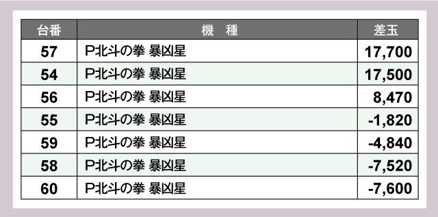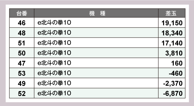 一方、パチンココーナーをチェックすると北斗の拳シリーズから万発超を多数確認、『P北斗の拳 暴凶星』から+17,000発超が2台、『e北斗の拳10』からは46番台が怒涛の+19,150発を叩き出す好成績を残している。