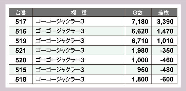 まず、パチスロコーナーを見ると『スマスロ北斗の拳』から+7,070枚が発生。そして、Aタイプながら『ゴーゴージャグラー3』も奮闘しており、+1,000枚超が3台、そのうち517番台が+3,390枚を記録し店内を盛り上げていた。