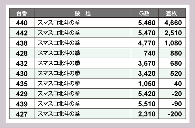 まずは、パチスロコーナーを見てみると『スマスロ北斗の拳』と『パチスロ からくりサーカス』から+4,000枚超が発生。また、『マイジャグラーⅤ』では+2,000枚超が2台発生している上に約半数の台がプラス差枚で終了する見事な結果を残している。