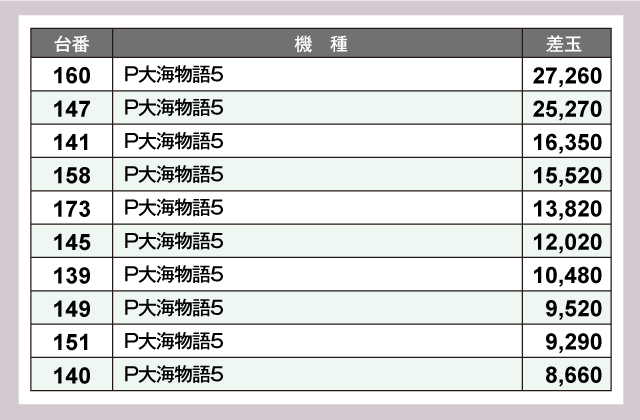 一方のパチンコは『P大海物語5』で万発超が大量発生!! なかでも147番台と160番台が+20,000発超を叩き出す圧巻のパフォーマンスを見せており、シマ内は終日ファンの笑顔で溢れ返っていた。
