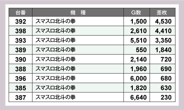 まず、パチスロでプレイヤーの注目を集めたのが『スマスロ北斗の拳』で、+4,000枚超が2台も発生している上に、半数以上の台がプラス差枚で終了する見事な結果を残しファンを喜ばせていた。
