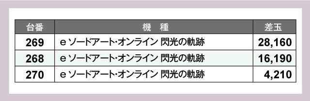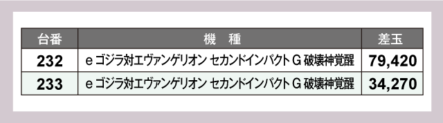 次にパチンコをチェックしてみると、導入直後の新台『e ゴジラ対エヴァンゲリオン セカンドインパクト G 破壊神覚醒』で圧巻の+79,420発を記録。また、同じく新台の『e ソードアート・オンライン 閃光の軌跡』からも+28,160発が飛び出している。